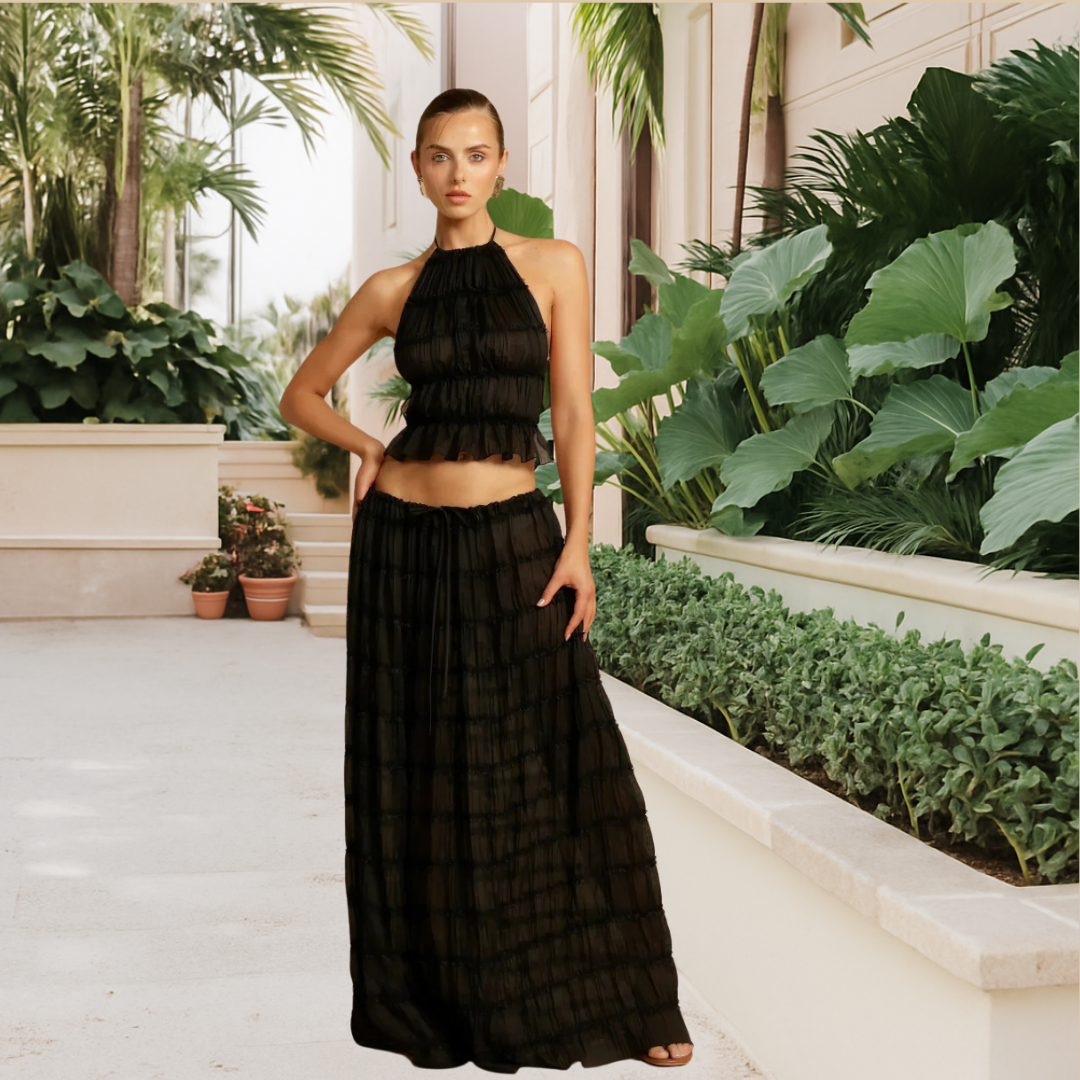 A light skirt, a structured top, a look that dances with you.